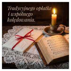 Tradycyjne życzenia bożonarodzeniowe z opłatkiem w tle