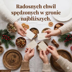 • Niech te święta przyniosą wam ukojenie i pozwolą zapomnieć o troskach. Życzę wam cudownych chwil spędzonych na rozmowach, śmiechu i wspólnym byciu razem.