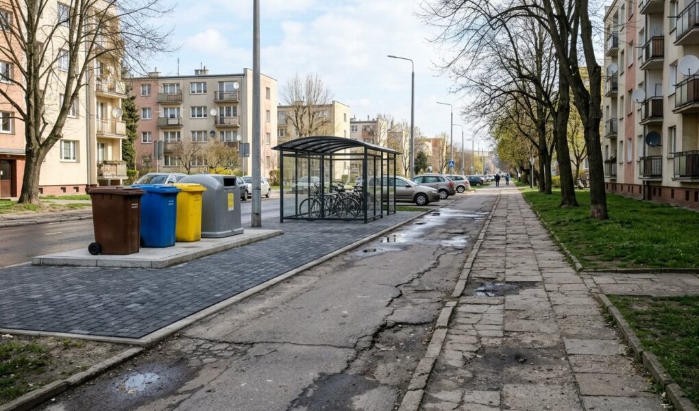 Zarządcy terenu skupiają się między innymi na uporządkowaniu kwestii wiat śmietnikowych. Warto przypomnieć, że po zachodniej stronie ulicy Kotsisa wykonano już utwardzoną zatokę na pojemniki oraz wiatę rowerową. Obecnie planowana jest podobna modernizacja na odcinku między ulicami Kotsisa a Stanisławskiego.